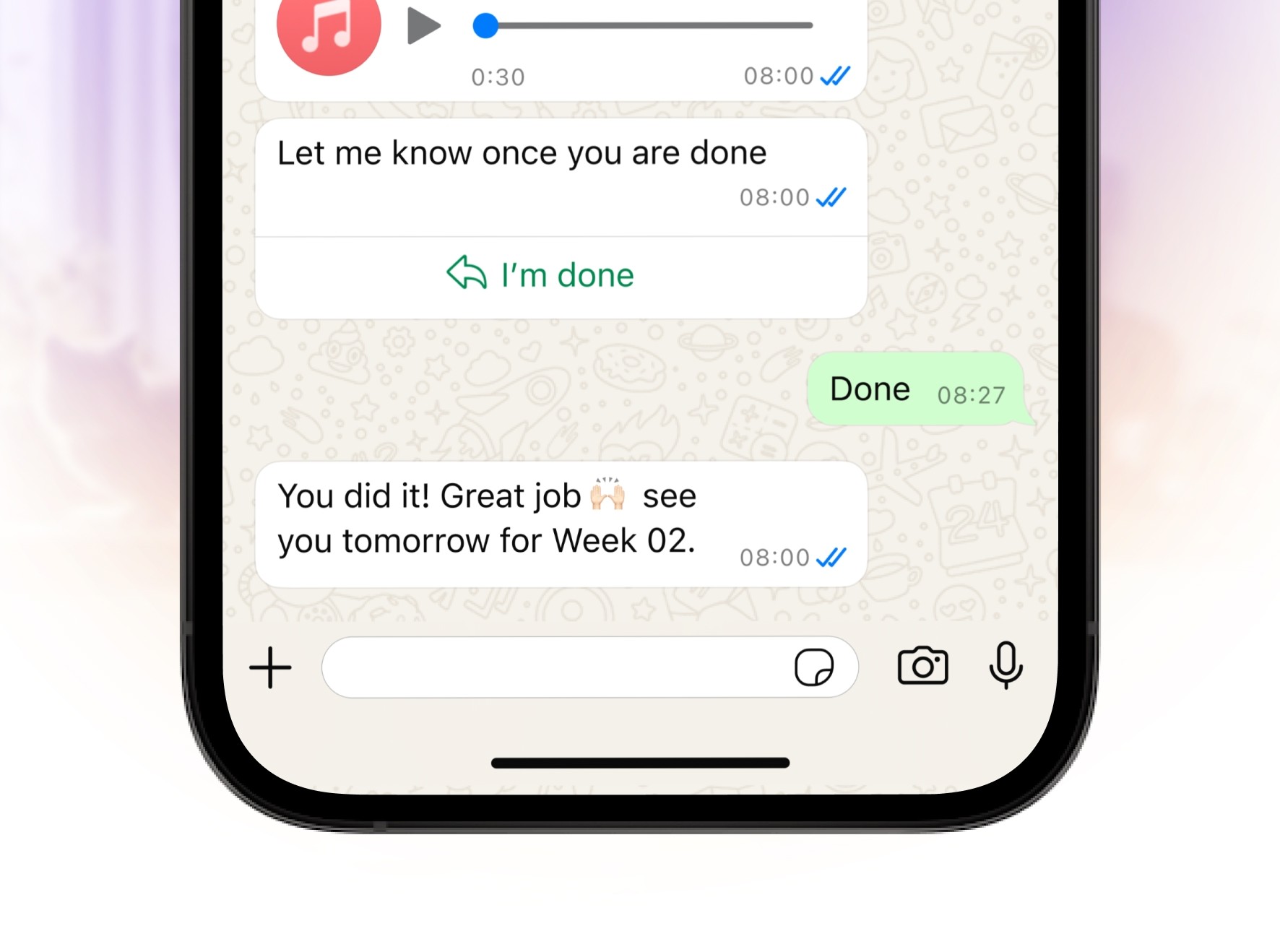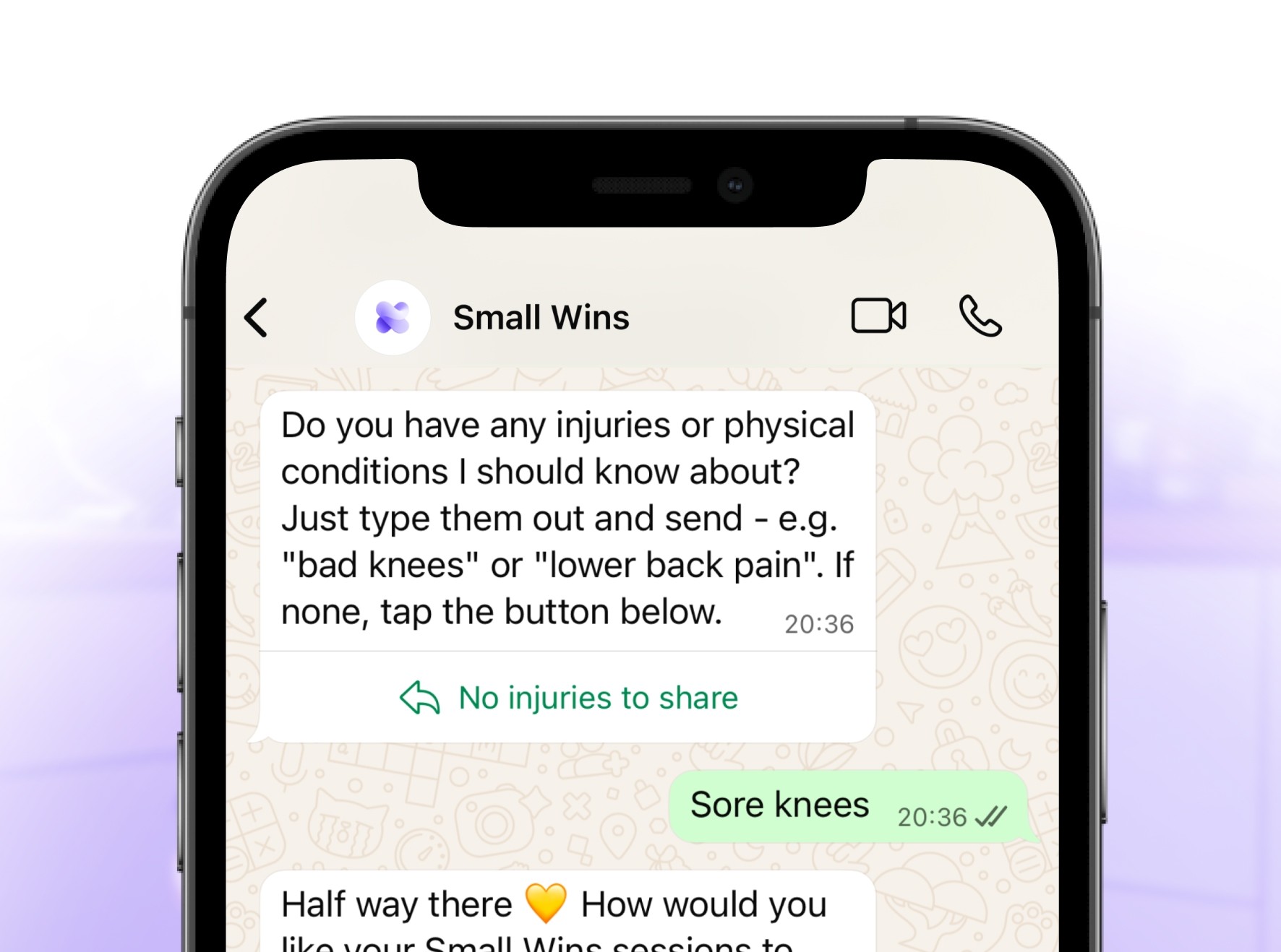 Five quick questions on WhatsApp so your coach can personalise your experience to your body, your goals, and your pace.